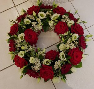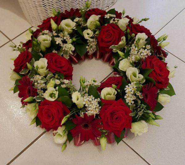 Funeral Wreath Ring in Red and White flowers.