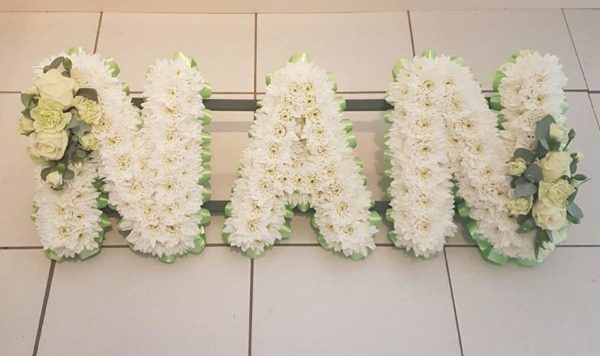 Nan funeral tribute in green and white flowers.