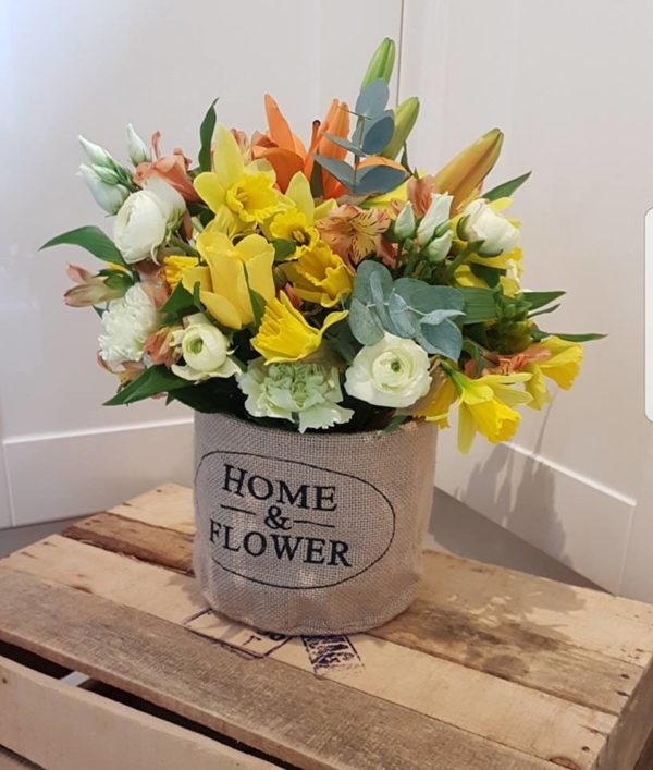 Mixed Flower Basket in Yellow, Green and Cream Flowers.